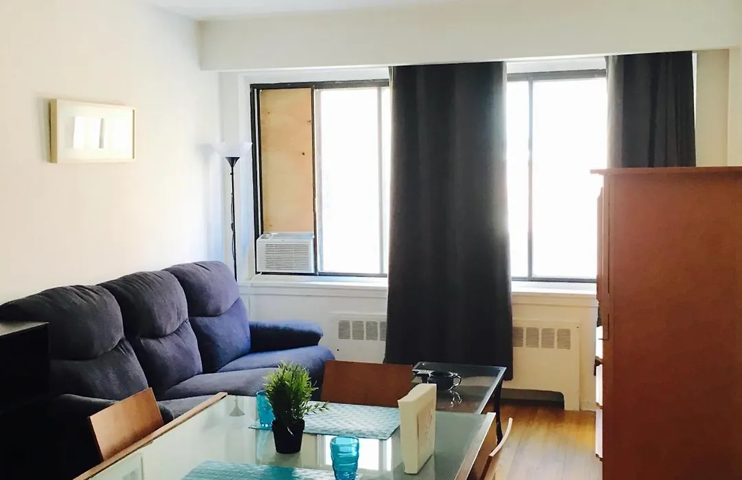 El Stylish Montreal Apartment: Comfortable Stay In The Golden Square Mile ofrece vistas a la ciudad e incluye una zona de estar con climatizador. Además de sofá y un escritorio, el interior cuenta con ventanas insonorizadas. Este apartamento consta de 1 dormitorio. Hay 1 cuarto de baño con un inodoro separado de la ducha y bañera, además de secadores de pelo y toallas.